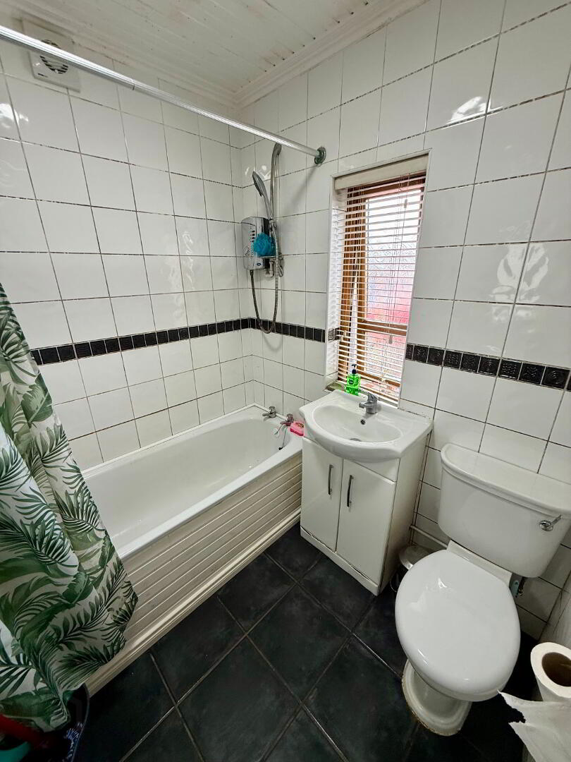 A ground floor family bathroom offering a four-piece suite, comprising WC, wash hand basin, bath tub, and an overhead electric shower, complemented by fully tiled walls and flooring, and an extractor fan.
