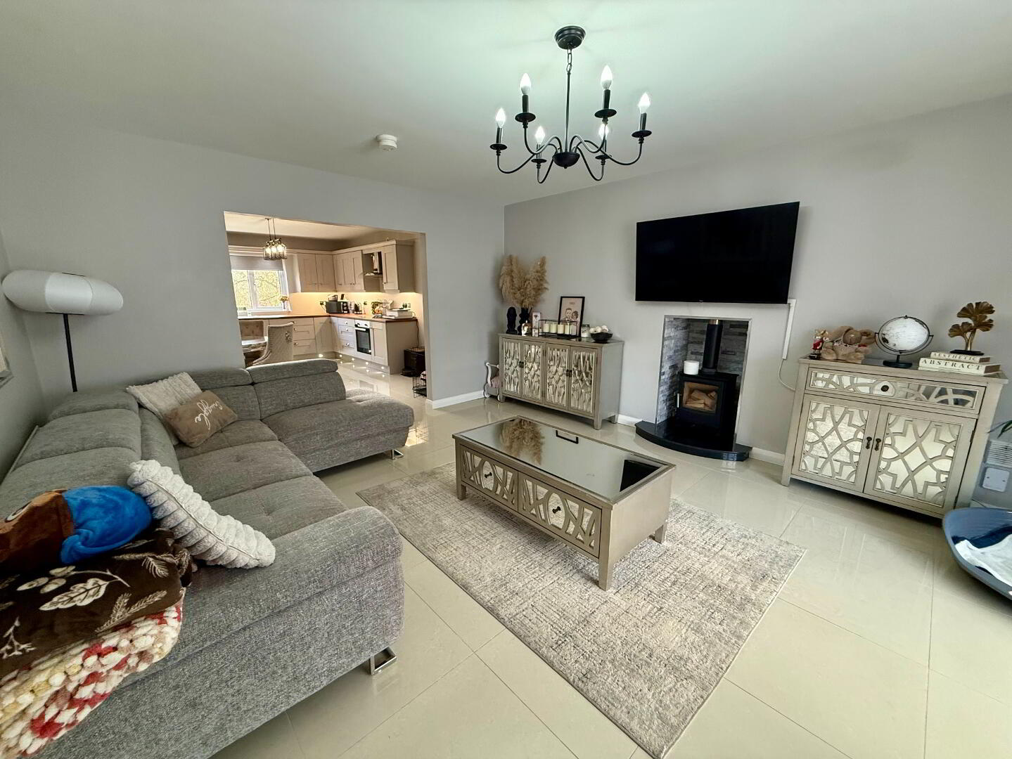 Spacious family living room featuring a bay window, tiled flooring, and a wood-burning stove. The room also benefits from TV and electrical points, with open-plan access to the kitchen/diner, creating an ideal space for modern living.