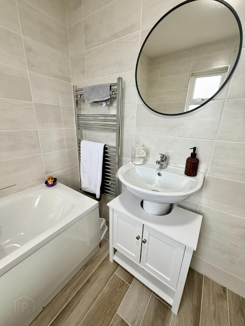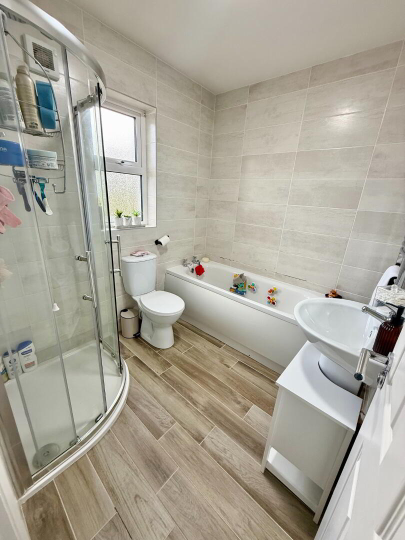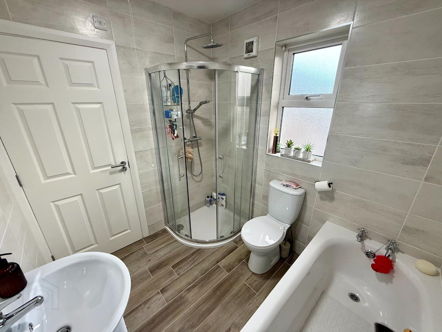 Spacious family bathroom comprising a four-piece suite to include WC, wash hand basin, bath tub, and walk-in corner shower. Finished with fully tiled flooring and walls, and a wall-mounted heated towel rail.