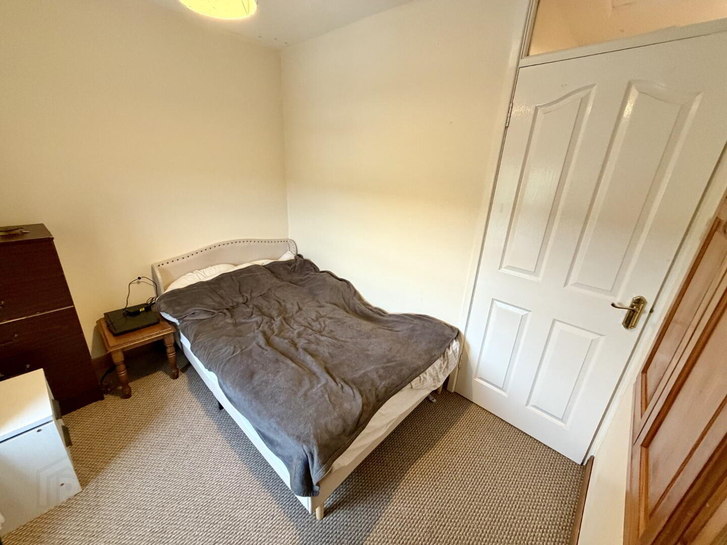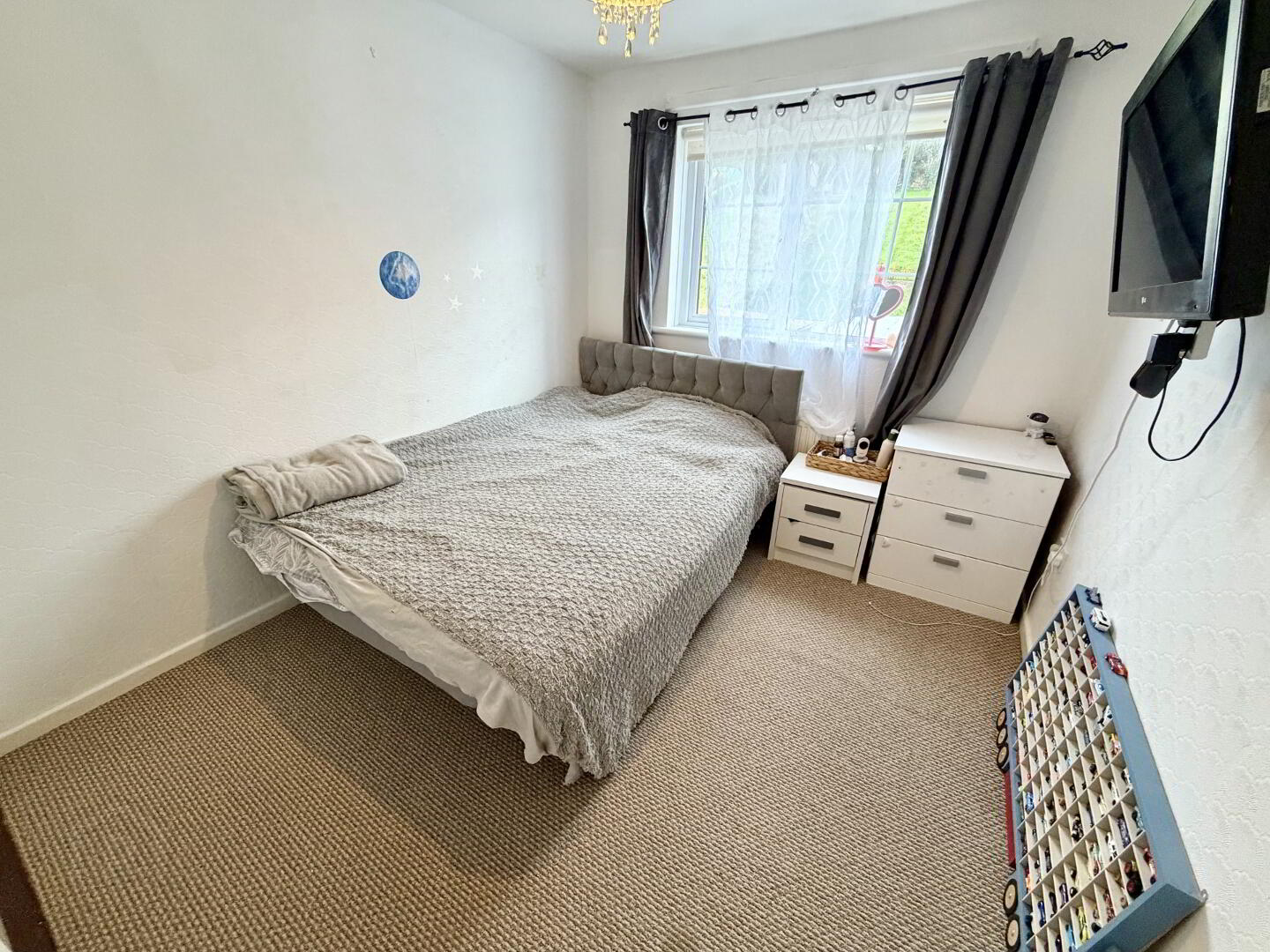 Rear aspect double bedroom with built-in wardrobe and carpet flooring.