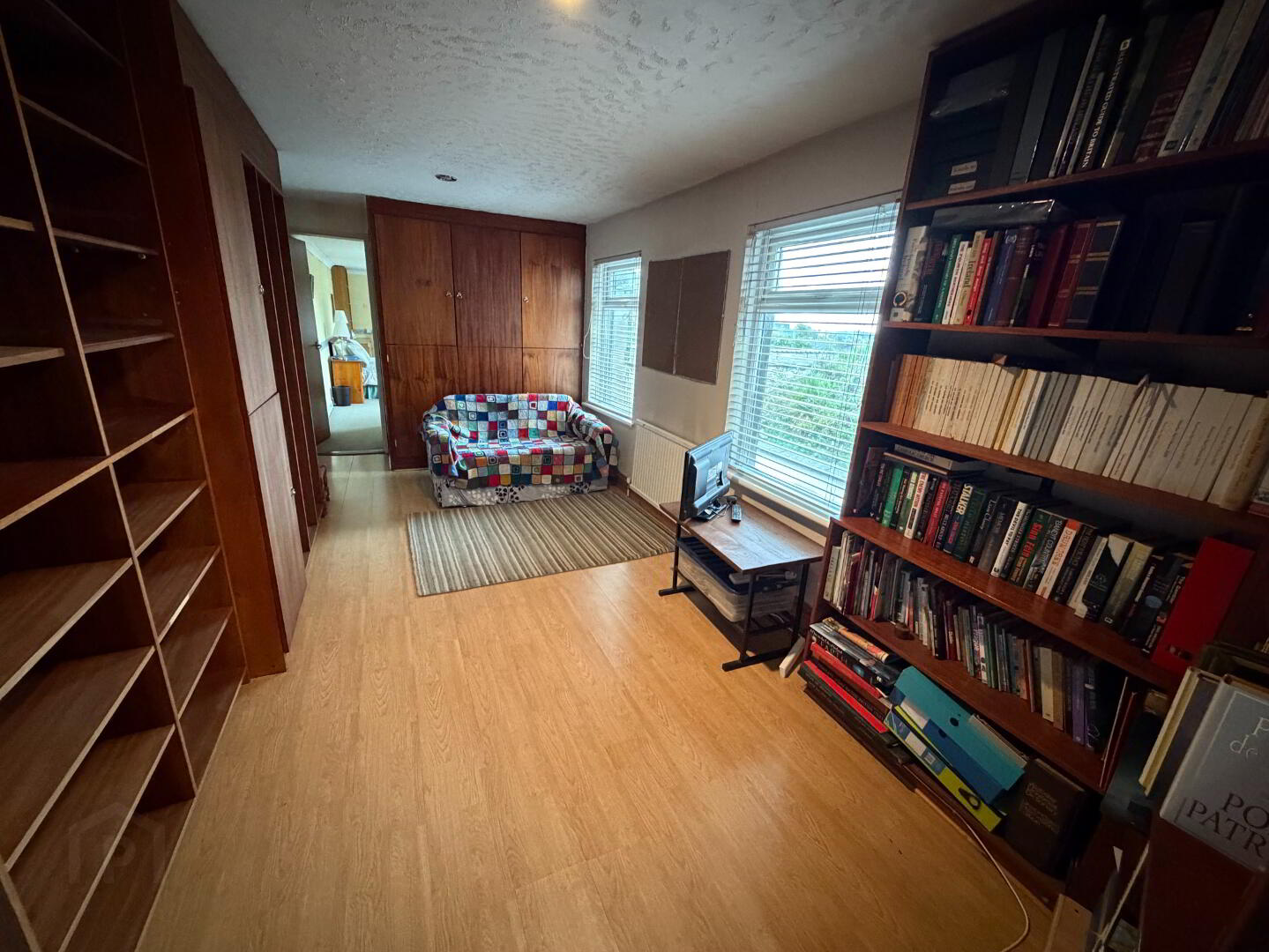 Versatile first-floor room with wood-effect flooring and built-in storage units. Can be used as a bedroom, home office, or playroom.