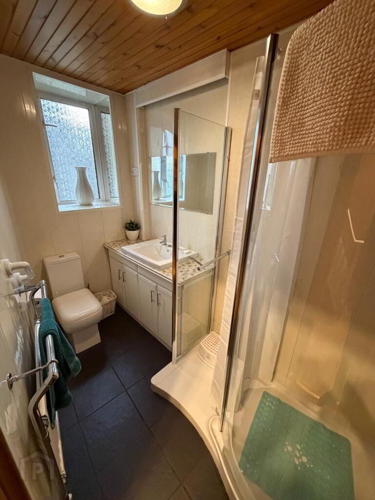 Three-piece bathroom with WC, wash hand basin, and walk-in shower. Finished with tiled flooring, part-tiled walls, and PVC panelling for easy maintenance.