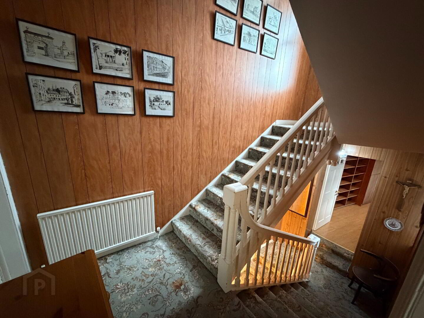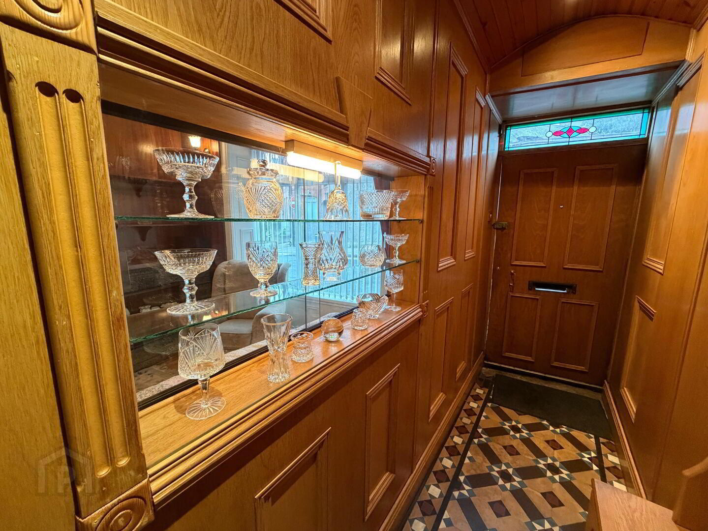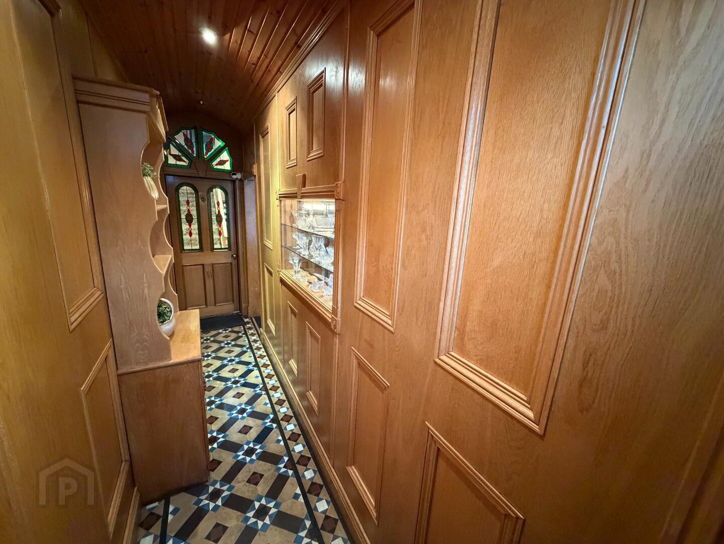 Welcoming entrance hall finished with tiled flooring and wood-panelled walls.
