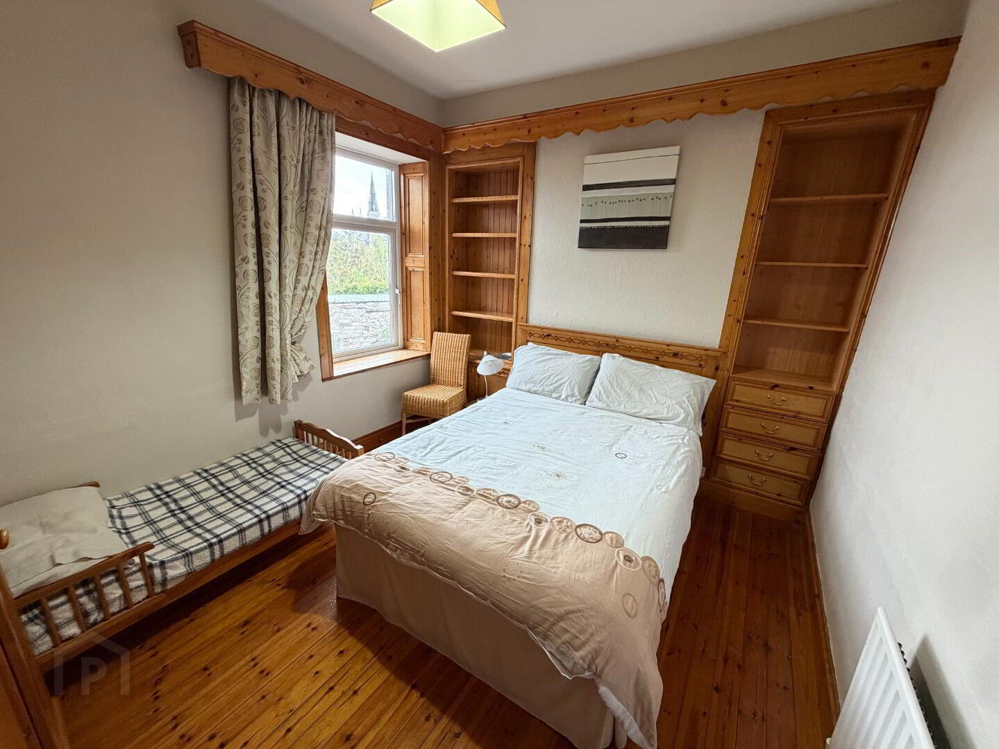 Versatile first-floor room with wood-effect flooring and built-in storage units. Can be used as a bedroom, home office, or playroom.