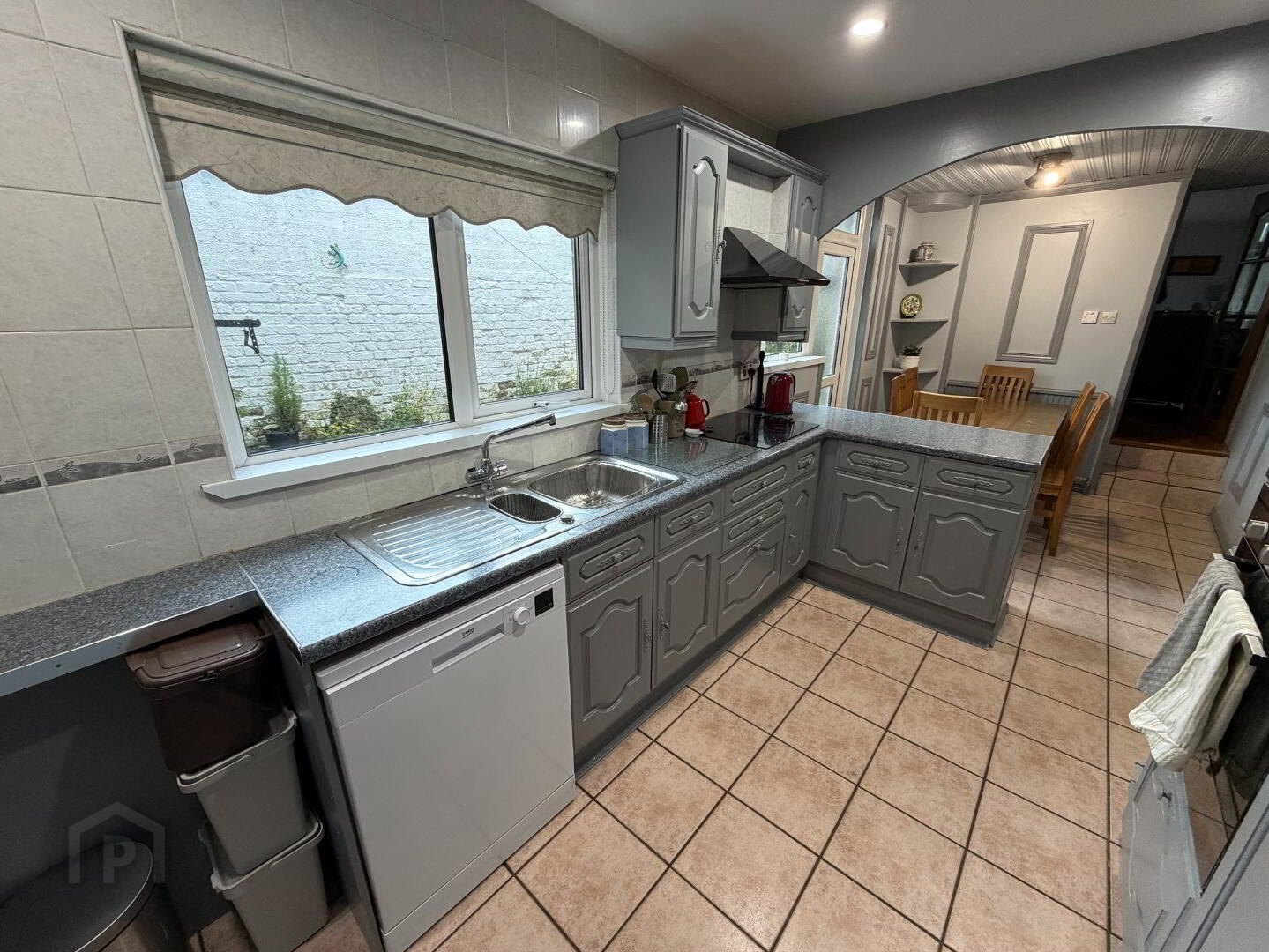 Open-plan kitchen and dining area fitted with high and low units and built-in appliances, including an electric hob with overhead extractor fan, cooker, integrated fridge freezer, dishwasher, and stainless steel sink. The layout flows into the dining space with direct access to the rear courtyard and garden.