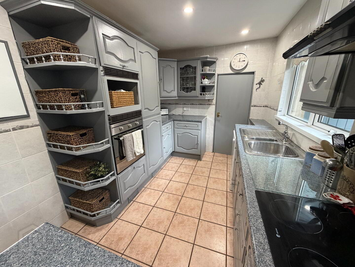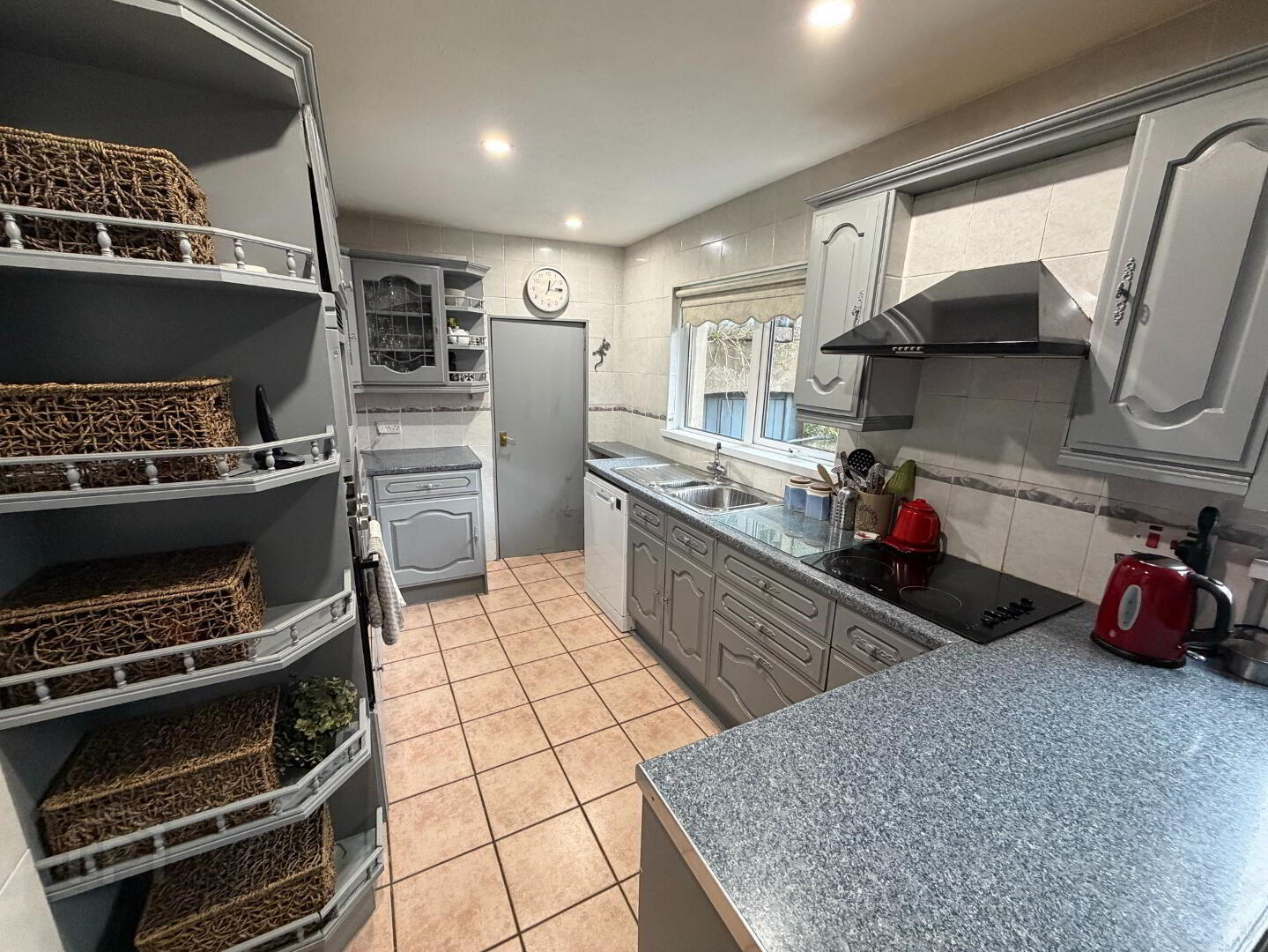Spacious utility room with high and low units, stainless steel sink, and plumbing for white goods. Houses the oil boiler and offers direct access to the rear garden and shed. Adjoining the utility is a ground floor bathroom.