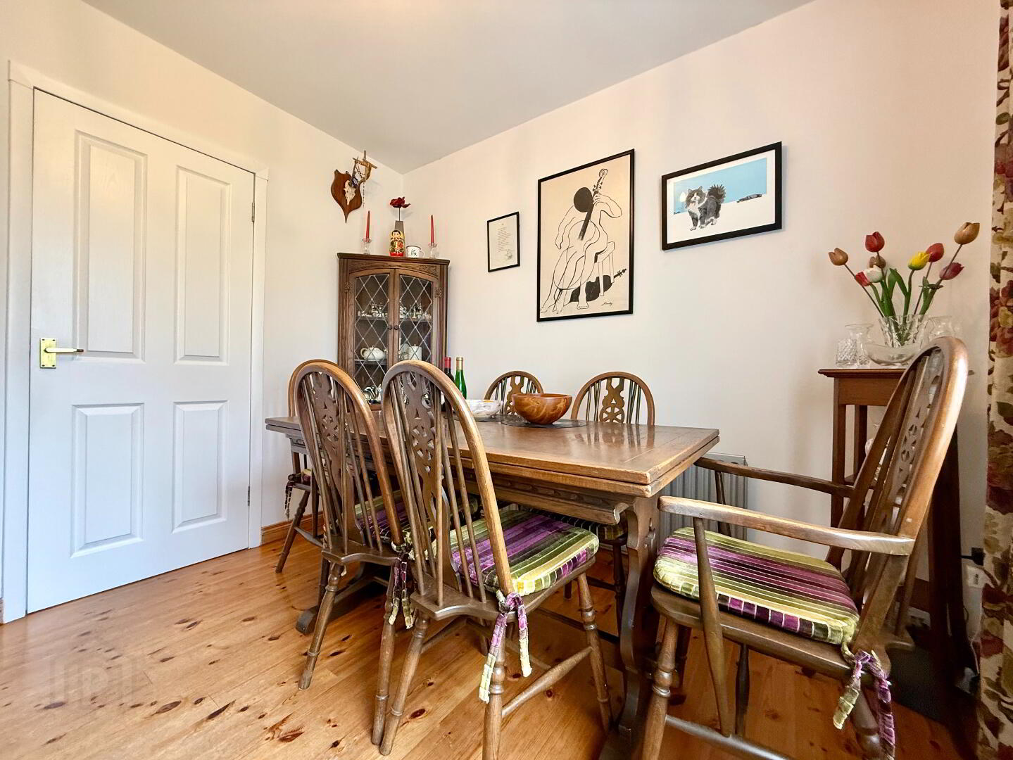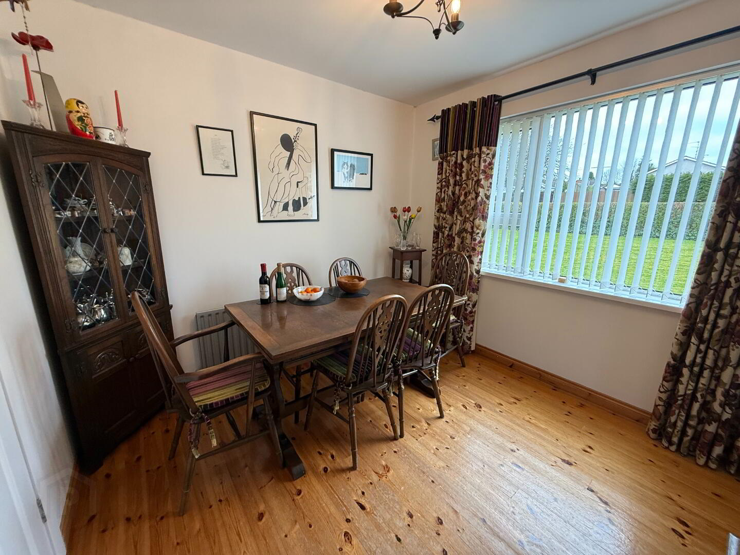A sizeable family dining space featuring wood flooring and a front aspect, with open-plan access through to the living room.