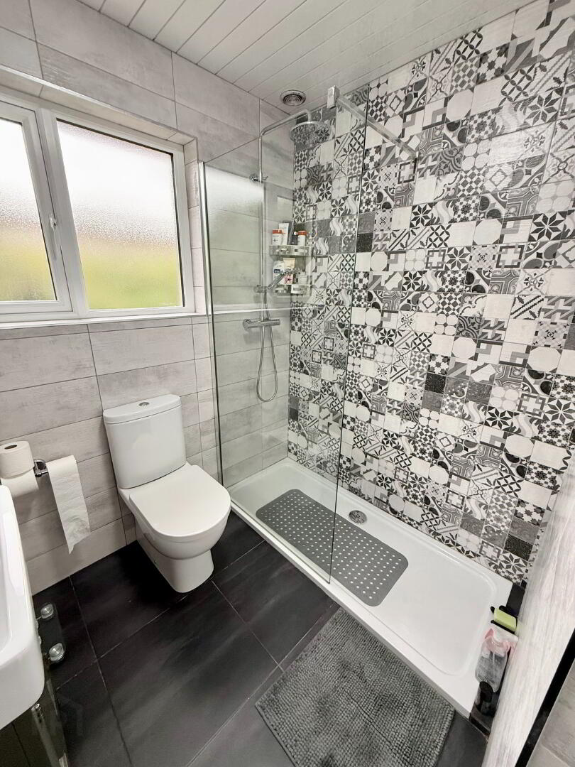 A recently renovated family bathroom comprising a modern three-piece suite, including a large walk-in shower, WC, and wash hand basin. The room is finished with fully tiled walls and flooring, PVC ceiling, a wall-mounted towel radiator, and an extractor fan.