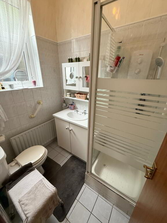 Compact shower room with a three-piece suite comprising WC, wash hand basin and electric corner shower. Finished with fully tiled walls and flooring for easy maintenance.