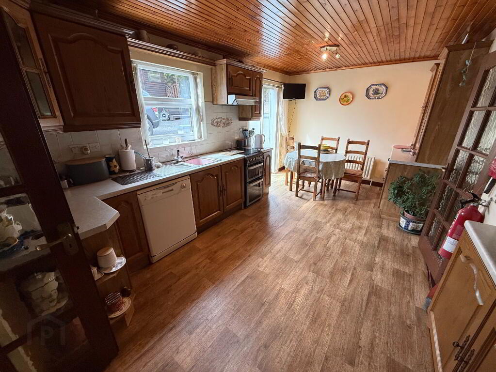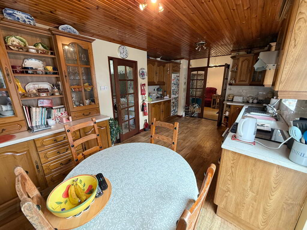 Spacious kitchen with a full range of high and low units, including two display cabinets. Fitted for a gas cooker, extractor fan, fridge, and plumbed for a dishwasher. Finished with wooden-style flooring and ceiling. The dining area features sliding patio doors that open to a large, private, fenced, and tree-lined yard, laid out in tarmac for easy upkeep.