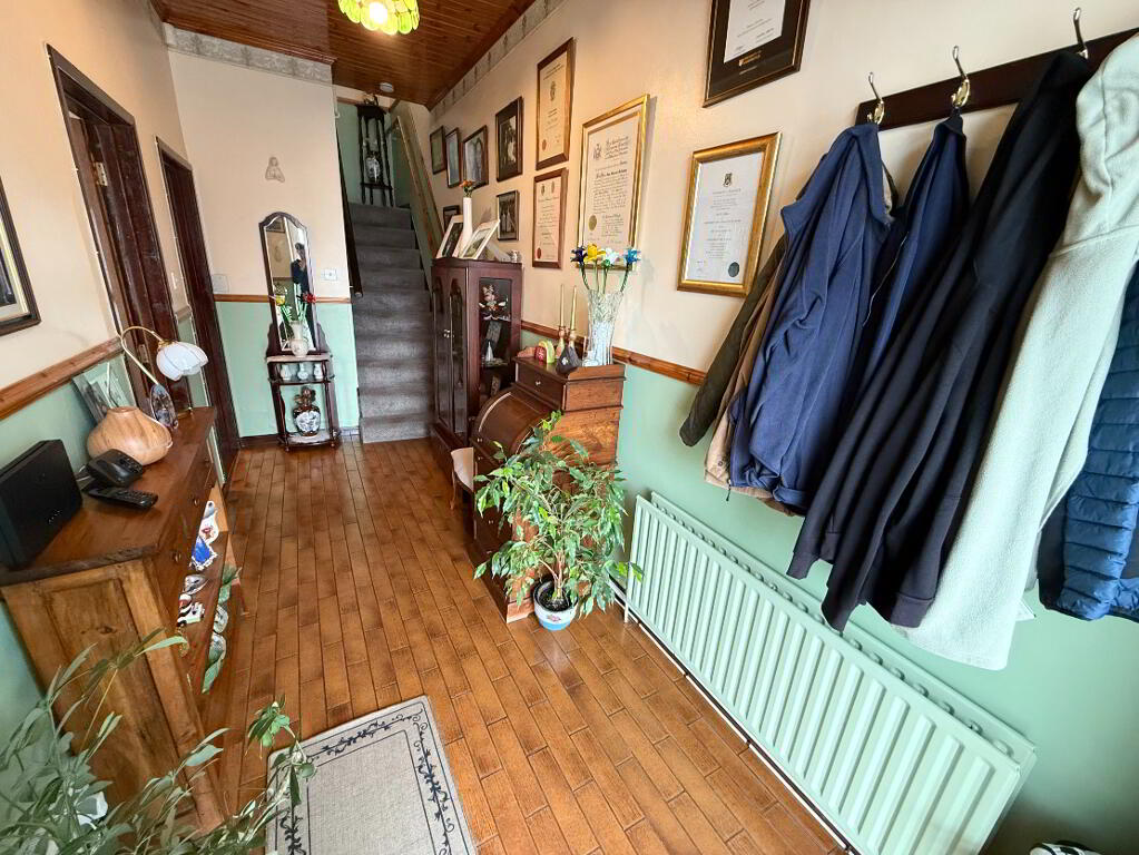 A generous and welcoming entrance hall, filled with natural light and finished with fully tiled flooring and a wooden ceiling. Complete with a phone point and direct access to the fully carpeted staircase and landing area. This room contains the main broadband box, providing a direct Wi-Fi connection throughout the home.