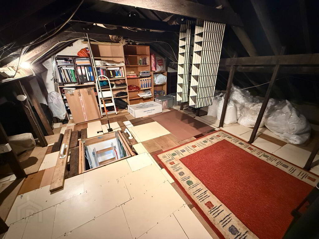 Fully floored attic space with fitted shelving and electricity, offering excellent additional storage. Accessed via a pull-down fitted ladder with a secure closed hatch/door.