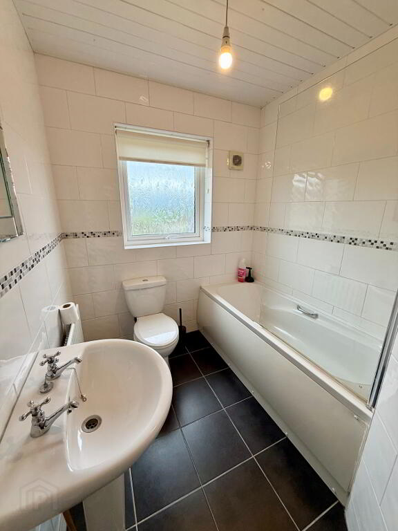 Spacious family bathroom fitted with a four-piece suite comprising WC, wash hand basin, and bath with overhead electric shower. Finished with tiled flooring and fully tiled walls, and benefits from an extractor fan.