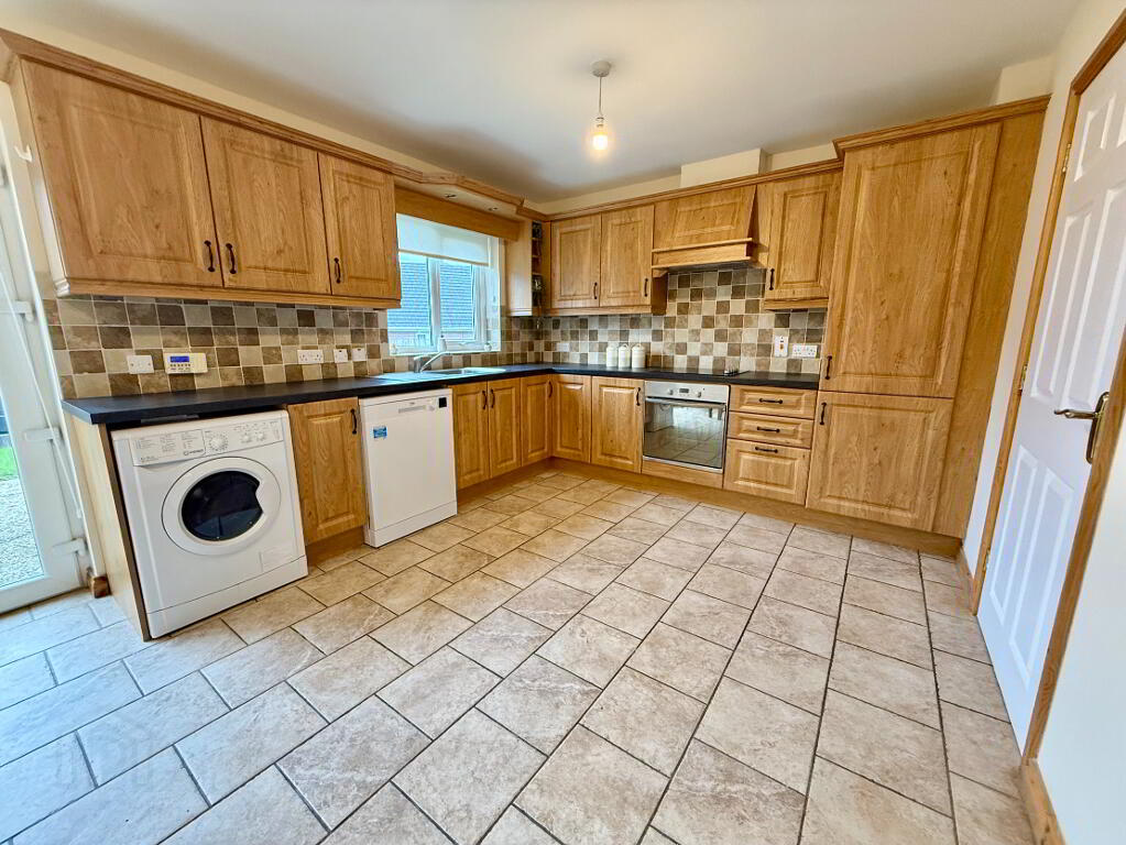 Spacious family kitchen diner fitted with tiled flooring and a range of high and low level units. Comprises an integrated cooker, electric hob with overhead extractor fan, and integrated fridge freezer, with additional space for appliances such as a washing machine and dishwasher. The room offers ample space for family dining and benefits from double patio doors leading to the large enclosed rear garden.
