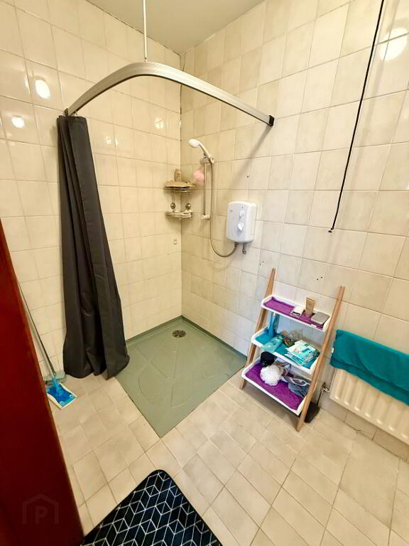 Well-proportioned en-suite comprising a walk-in shower, WC, and wash hand basin.