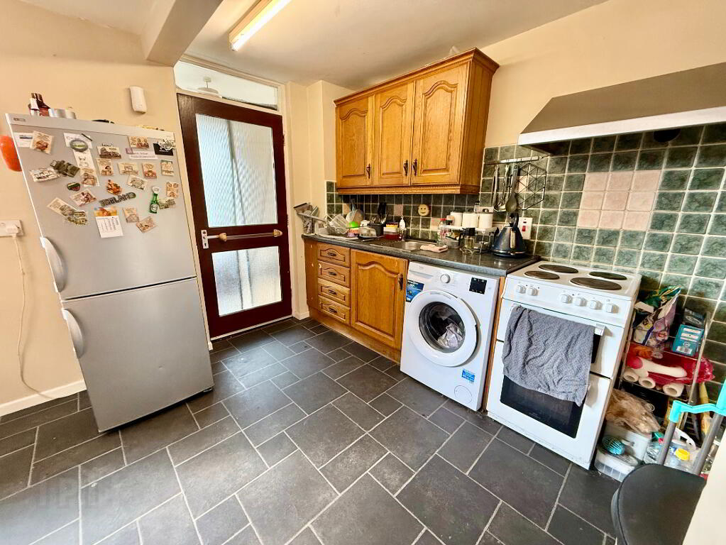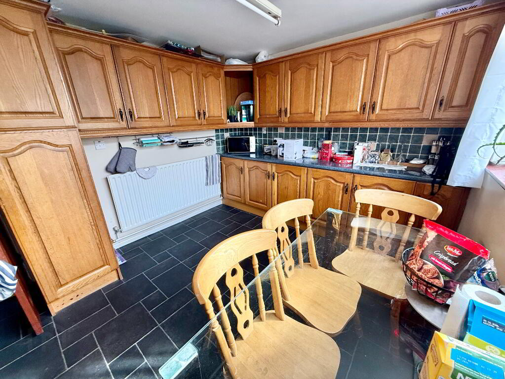 Fully fitted kitchen with a range of high and low units. Integrated appliances include oven, electric hob with overhead extractor fan, and fridge freezer. Plumbed for washing machine and tumble dryer. Generous open-plan dining space.