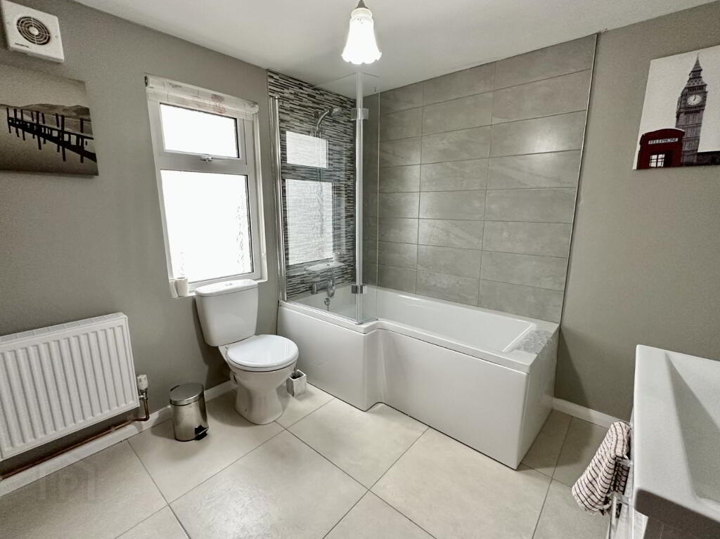 Recently fitted large family bathroom offering four piece white bathroom suite. Double glazed UPC window to rear. Partially tiled walls and flooring. Suite to include WC, wash hand basin, bath tub and overhead shower.